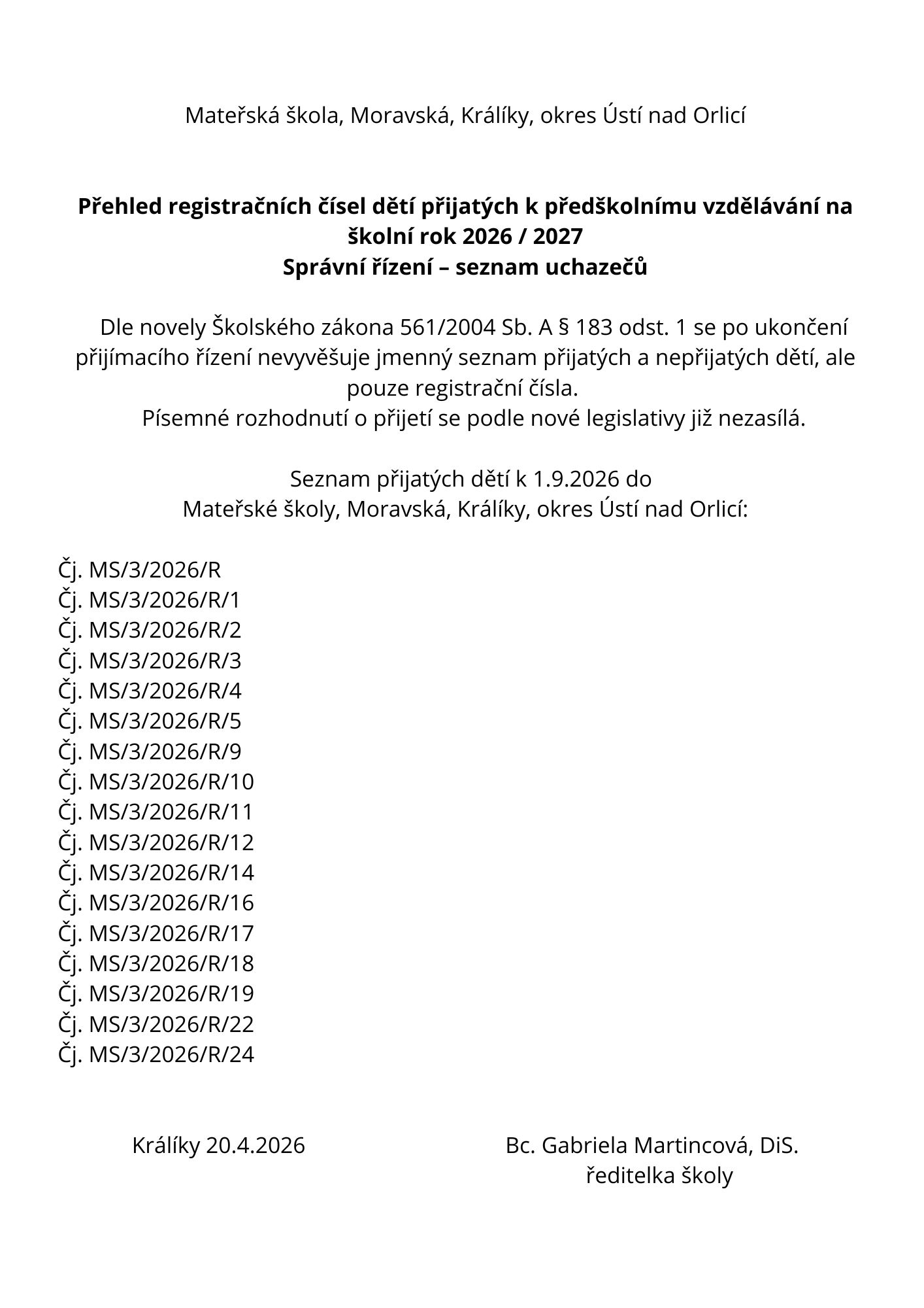 Každý pátek jsme tu pro Vás a Vaše děti, přijďte si pohrát a postupně své dítě zvykat na novou životní etapu. Je to vhodný čas na seznámení se se školku, jejími prostory, aktivitami, ale i paními učitelkami a to vše s Vaší asistencí.